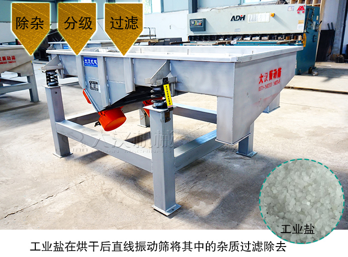 工業(yè)鹽在烘干后需要經(jīng)過皮帶輸送機(jī)輸送到料倉中等待包裝出庫,然而在皮帶機(jī)輸送料倉的過程中,很有可能會產(chǎn)生結(jié)塊或者有異物落入工業(yè)鹽中,因此需要使用直線振動篩將其中的雜質(zhì)過濾除去。
