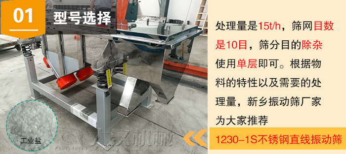 下面小編從型號選擇、方案設(shè)計、篩機(jī)材質(zhì)這三個方面給大家介紹一下篩分工業(yè)鹽用直線振動篩好在哪里?希望這個簡單的技術(shù)分享便于各位需要工業(yè)鹽篩分用戶參考: