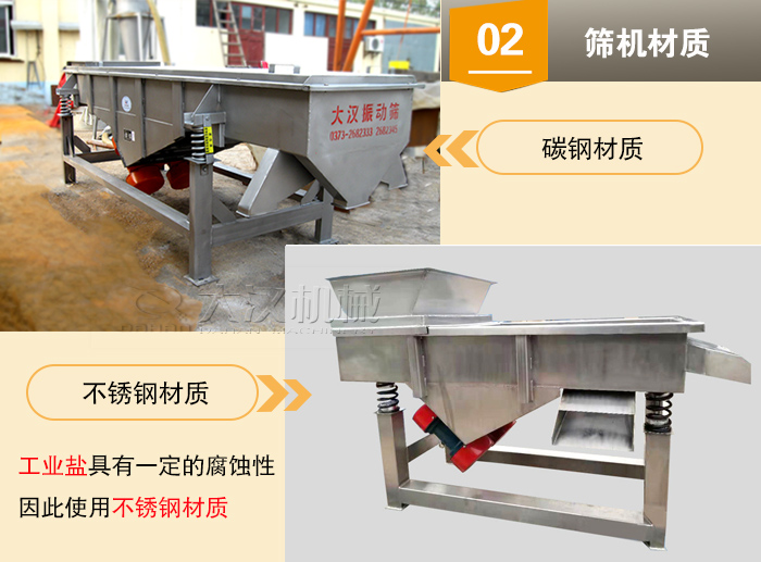 【篩機(jī)材質(zhì)】——常用的直線振動篩有不銹鋼和碳鋼兩種材質(zhì),因為工業(yè)鹽具有一定的腐蝕性,因此使用不銹鋼材質(zhì),使用時間更長,對物料也具有保護(hù)作用。