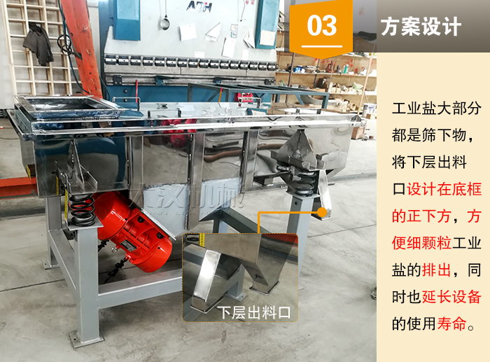 【方案設(shè)計】——工業(yè)鹽大部分都是篩下物,因此要對直線振動篩的下出料口進(jìn)行改造,將下層出料口設(shè)計在底框的正下方,方便細(xì)顆粒工業(yè)鹽的排出,同時也延長設(shè)備的使用壽命。
