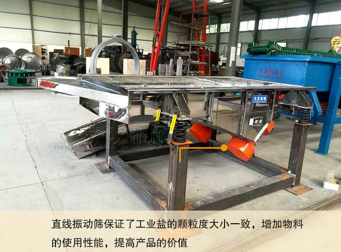 工業(yè)鹽在生產(chǎn)包裝發(fā)貨前可能會混有雜質(zhì),所以需要使用振動篩先將其篩分過濾掉,才能進(jìn)入下一步的包裝機(jī)中,在工業(yè)鹽生產(chǎn)線上通常需要有兩道振動篩來對物料的品質(zhì)進(jìn)行把控,所以大漢根據(jù)多年篩選經(jīng)驗推薦您使用直線振動篩來篩分工業(yè)鹽。