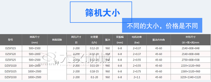 煙草直線振動篩的大小有多種(如:DZSF-515、DZSF-520、DZSF-1020、DZSF-1230、DZSF-1540等),不同的大小,價格是不同的,相關參數及配置也是不同的,所以價格具一定的差異。不同的篩機大小可以滿足從小到大的各種產量需求。煙草直線振動篩每小時產量可達200KG-10T