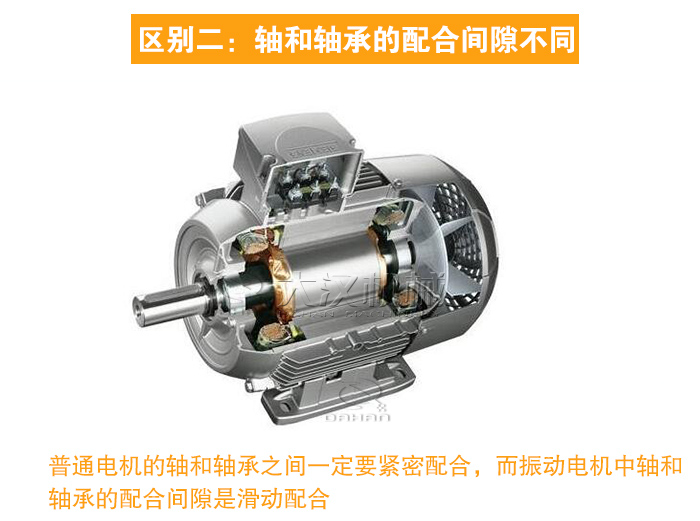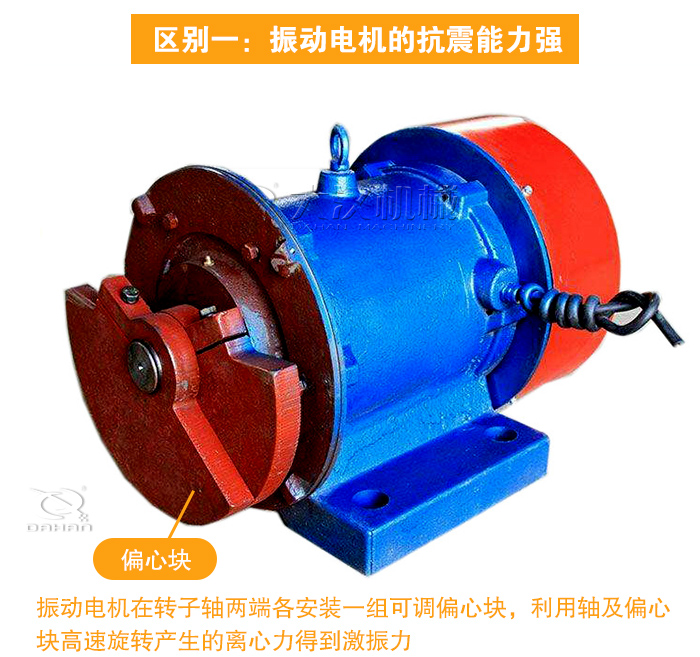 振動電機和普通電機的內部結構相同。主要區別是振動電機在轉子軸兩端各安裝一組可調偏心塊,利用軸及偏心塊高速旋轉產生的離心力得到激振力。振動電機比普通電機的機械和電氣方面都要求有可靠的抗震能力。同樣功率等級的振動電機的轉子軸要比同級別普通電機的軸粗得多。