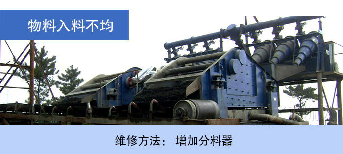進(jìn)入圓振篩的下料漏斗,是一個(gè)人字型的漏斗,而入料皮帶時(shí)常跑偏和漏斗積泥等原因,導(dǎo)致分料不均,從而致使一邊篩網(wǎng)嚴(yán)重過(guò)載,而另一邊篩網(wǎng)近乎空載運(yùn)行,所以常造成篩網(wǎng)磨損不均破損較快。