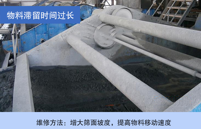 礦石在篩網(wǎng)上移動(dòng)慢,礦石移動(dòng)速度過(guò)慢,導(dǎo)致篩面上積礦過(guò)多,使圓振篩總是在超負(fù)荷的狀態(tài)下運(yùn)行,從而導(dǎo)致篩網(wǎng)破損快,撓性聯(lián)軸器撕裂、彈簧損壞、大梁斷裂、箱體開(kāi)裂等一系列故障。