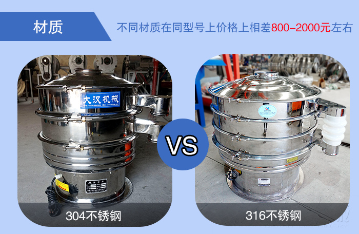 皂粉旋振篩材質上可分為304不銹鋼與316不銹鋼,不同材質在同型號上價格上相差800-2000元左右。皂粉旋振篩在結構材質上可分為全不銹鋼材質(整機不銹鋼材質)和不銹鋼+碳鋼材質(與物料部位為不銹鋼材質,底座為碳鋼材質)兩種。可根據不同的篩分使用環境來選擇不同的結構材質。