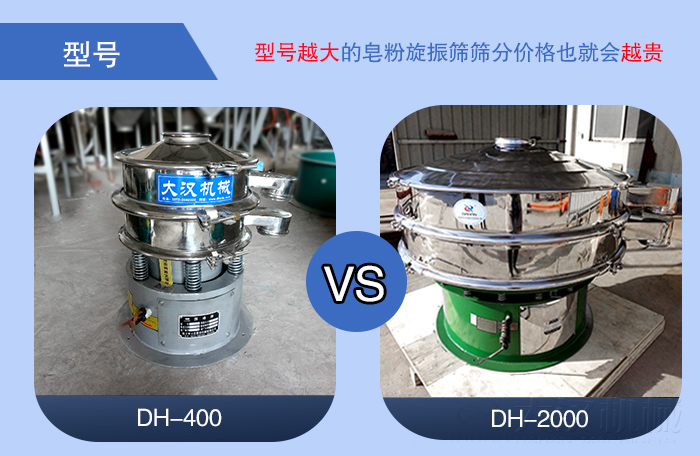 皂粉旋振篩的型號可分為DH-400、DH-600、DH-800、DH-1000、DH-1200、DH-1500、DH-1800、DH-2000等八種標準型號,型號差異主要是根據篩機直徑決定,直徑越大型號越大,隨之每小時篩分的皂粉產量就越大,型號越大的皂粉旋振篩篩分價格也就會越貴。