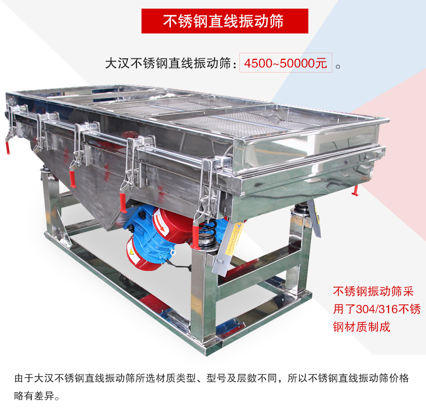 不銹鋼振動篩采用了304/316不銹鋼材質制成的,設備經由拋光處理,可以用于食品、醫藥等對衛生要求較為嚴格的行業,那么不銹鋼直線振動篩多少錢一臺呢?大漢小編這就來為您進行介紹。
